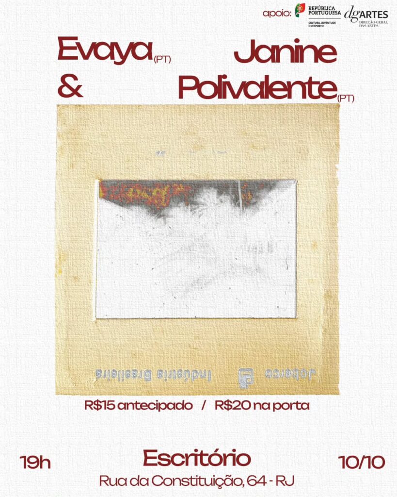 A cantora de trip-hop portuguesa Evaya faz show no Escritório, no dia 10, com Janine e Polivalente, e pela Usin4, em Cabo Frio, no dia 11. Ela é a entrevistada aqui da página no dia 24.
