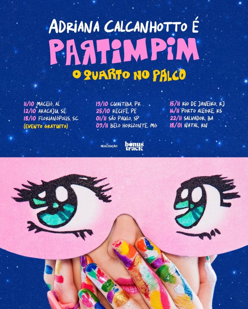 Tours – O trabalho de Adriana Calcanhotto para crianças, sob o pseudônimo Partimpim, é primoroso e de imensa qualidade artística e comemora 21 anos com a tour do belo álbum “O quarto” no Palco, com essas canções e mais outros sucessos de seus “tlês” álbuns, com mais de dez cidades agendadas. A banda é só com gigantes como Davi Moraes (guitarra), Marlon Sette (arranjos e trombone), Arimatéa (trompete) e Jorge Continentino (saxofone, clarinete e flautas), João Moreira (baixo), Luizinho do Jeje (percussão), Antonio Dal Bó (teclados e sintetizadores) e Thomas Harres (bateria). A turnê começa no sábado (11), no Teatro Gustavo Leite, em Maceió, e segue por Aracaju, no Teatro Tobias Barreto (12), Florianópolis, no Teatro Ademir Rosa (18), com entrada franga 🐔, Curitiba, no Teatro Guaíra (19), Recife, no Teatro Guararapes (25). Em novembro, é vez de São Paulo, no Vibra (1), Palácio das Artes, em Belo Horizonte (9), Rio de Janeiro, no Brava Arena Jockey (15), Porto Alegre, no Auditório Araújo Vianna (16) e Concha Acústica, em Salvador (22). Já tem data até em 2026, no dia 18 de janeiro, em Natal, no Teatro Riachuelo. “A cabra gritou mé” 🐐🎵.