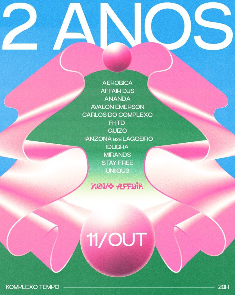 No sábado (11), às 19h30, a Novo Affair comemora dois anos, bem garota, na Mooca, no Komplexo Templo, com um line up estrelado com o sextante Carlos do Complexo, Idlibra, Aerobica, Affair DJs, Avalon Anderson, FHTD, Guizo, Ianzona b2b Lagoeiro, Stay Free, Uniqu3 e Mirands.