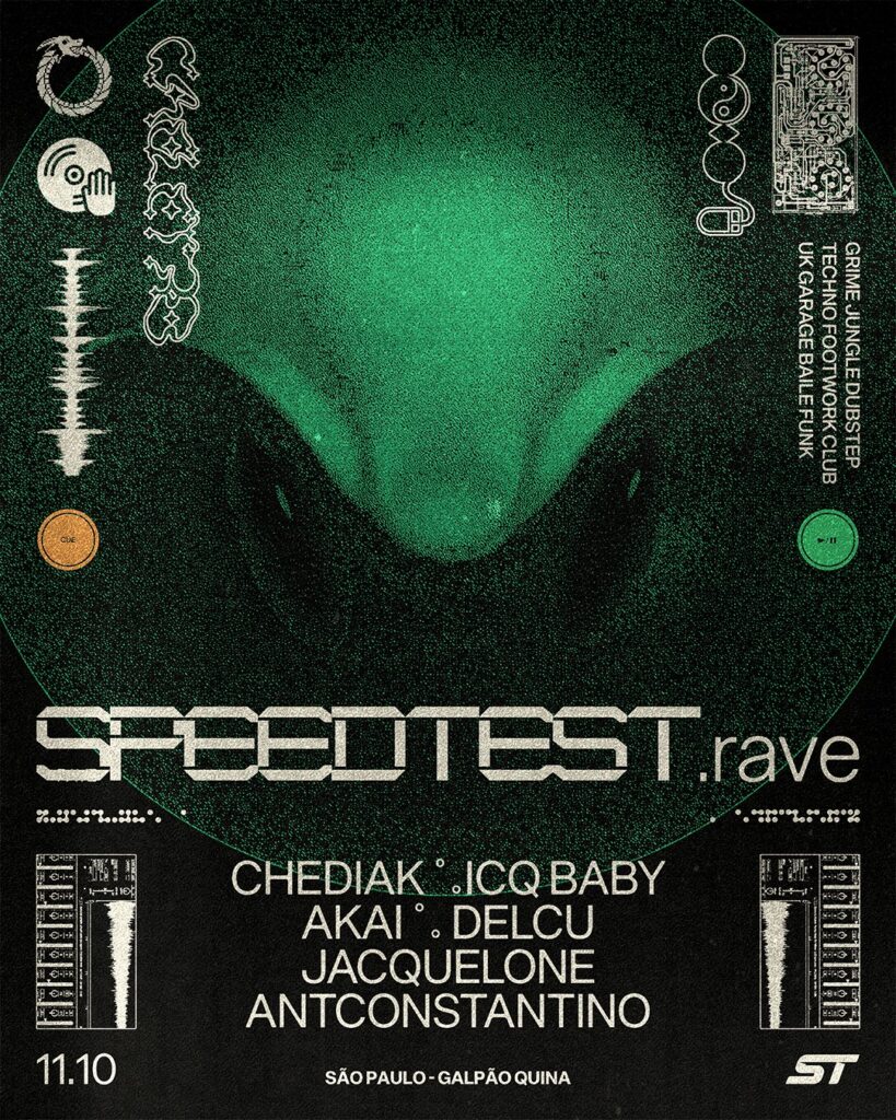 No sábado (11), às 22h, a Speedtest Rave Tour passa pela Galpão Quina, na Barra Funda, com o sextante Chediak, ICQ Baby, Akai, Delcu, Antcosntantino e Jacquelone.