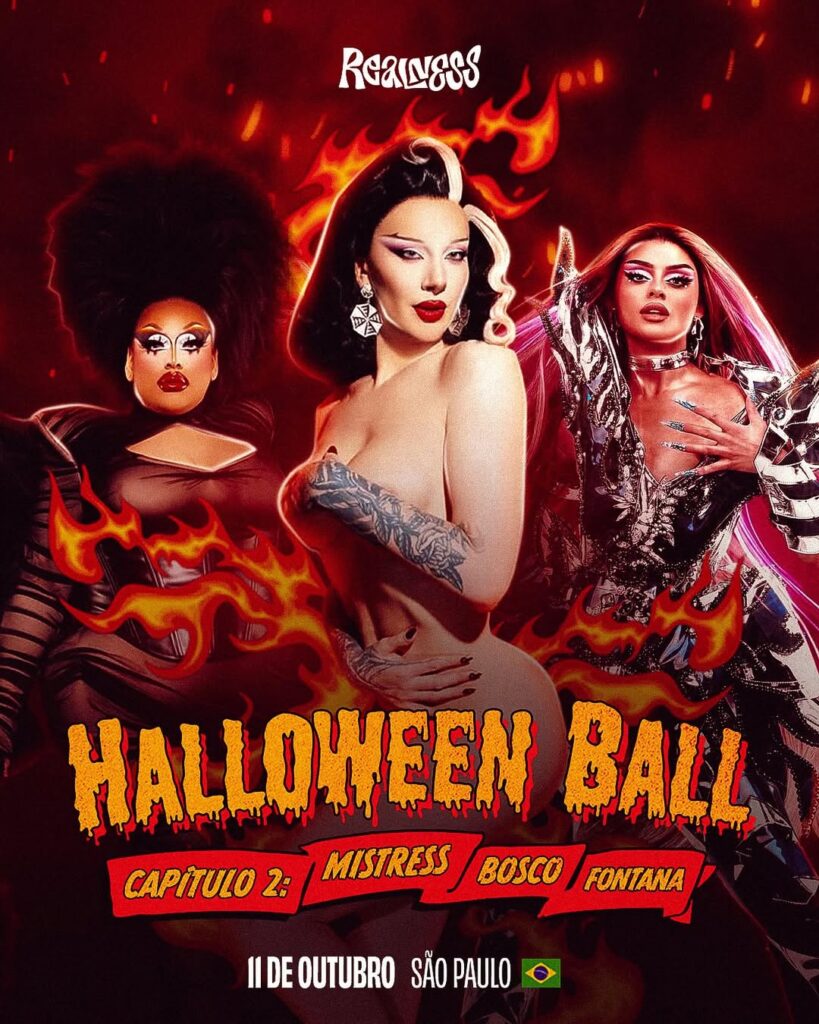 A Realness Halloween Bal: Capítulo Dois com Mistress Brooks, Bosco e a brasileira Fontana, Dacota Monteiro apresentando e performances de Desirée Beck, Chanel, Aimée Lumiere, Fedra, Halenka, Rafas Poul, Blue Addams e Summer Fever, neste sábado (11), no Espaço Usine, na Rua Barra Funda às 21h.