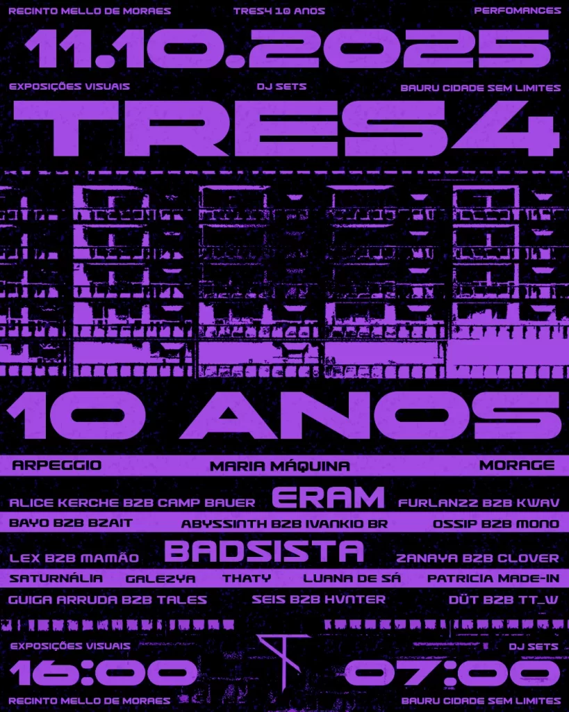 Bauru – A maior festa do interior, a TRES4, completa dez anos, neste sábado (11), às 16h, na “cidade sem limites”, no Recinto Mello de Moraes, com 15h de rolê, 25 DJs e cinco performances. No line up, pesadíssimo, Arpegio, Maria Máquina, Morage, Eram, o papi Badsista e grande elenco.