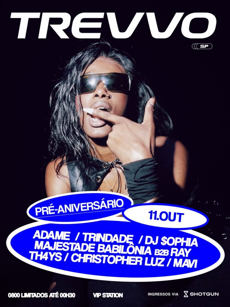 A Trevvo tá de pré aniversário e é eita atrás de eita com o sextante Adame, Trindade, DJ $ophia, Majestade Babilônia b2b com Ray, a produtora Th4ys que eu amo demais, Christopher Luz e Mavi, sábado (11), às 23h, no Vip Station.