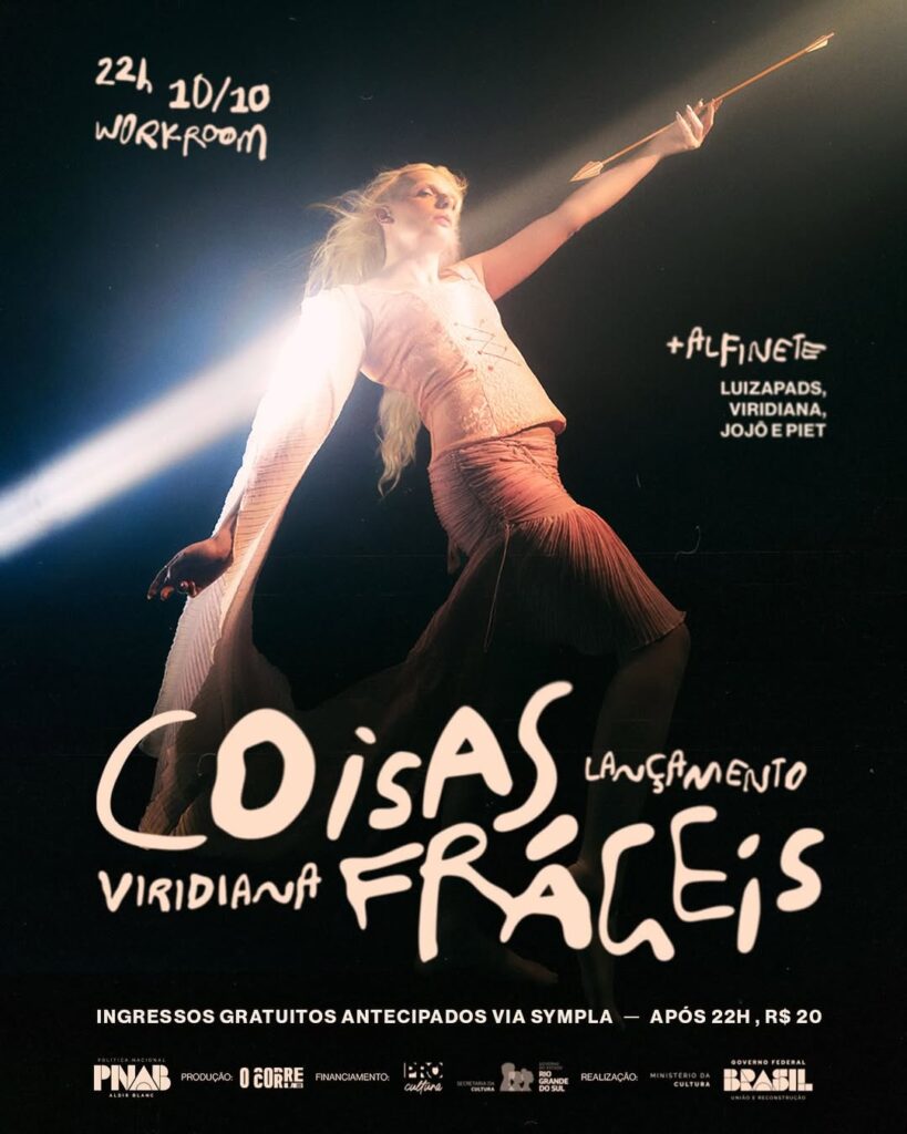 POA – A queen sextante Viridiana, que sextou semana passada com seu segundo álbum, “Coisas Frágeis”, faz show de lançamento gratuito, que é mais gostoso, nesta sexta (10), às 22h, no Workroom Bar Drag, com a a banda de coprodutores da flechada, André Garbini, Bernard Simon e Ricardo de Carli, além de Jojo Inacio Silva, nova aquisição. Depois, tem a festa Alfinete com os DJs Luiza Padilha, Jojo, Viriana e Piet. Os ingressos antecipados são gratuitos e tem que chegar 22h, corrão. Deu vontade.