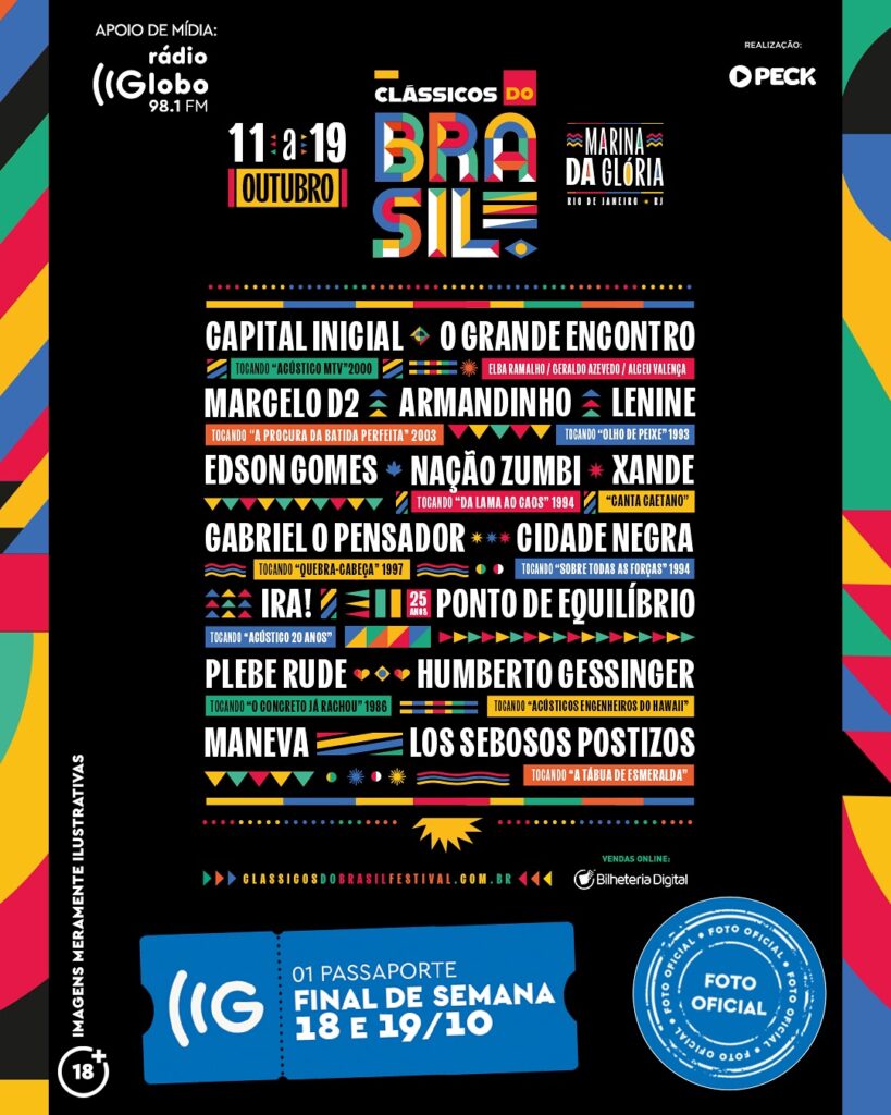 A 4ª edição do Festival Clássicos do Brasil terá quatro noites com shows inspirados em discos que entraram para a história da música brasileira, entre os dias 11 e 19 de outubro. Tem Marcelo D2, Nação Zumbi, Cidade Negra e Gabriel, o Pensador, sábado (11), O Grande Encontro com Elba Ramalho, Alceu Valença e Geraldo Azevedo, Lenine e Suzano, Xande Canta Caetano e Los Sebosos Postizos no domingo (12), Capital Inicial, Ira!, Humberto Gessinger e Plebe Rude, no sábado (18) e Edson Gomes, Maneva, Armandinho e Ponto de Equilíbrio, no domingo (19).