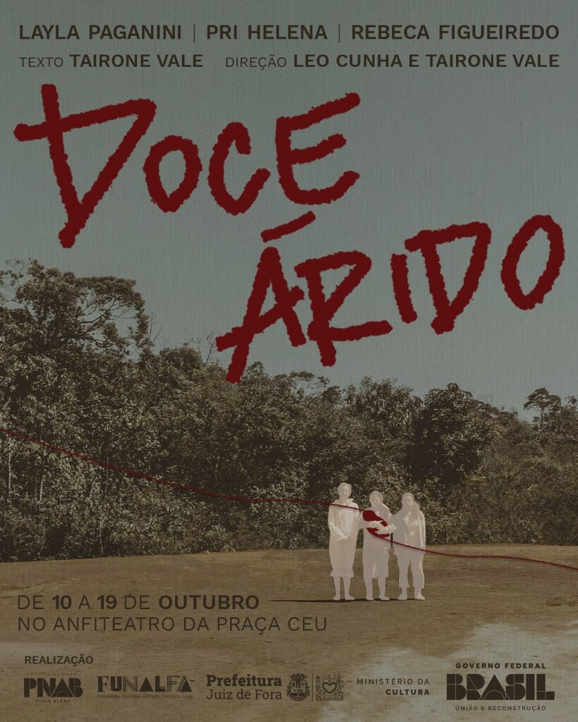 O espetáculo “Doce Árido”, com texto de Tairone Vale, que também assina a direção com Leo Cunha e tem apresentações de 10 a 12 e de 17 a 19, sextas e sábados, às 20h, e domingos, às 19h, no Anfiteatro da Praça CEU. Na história, três gerações de mulheres sustentam a casa com a produção artesanal do doce de leite.