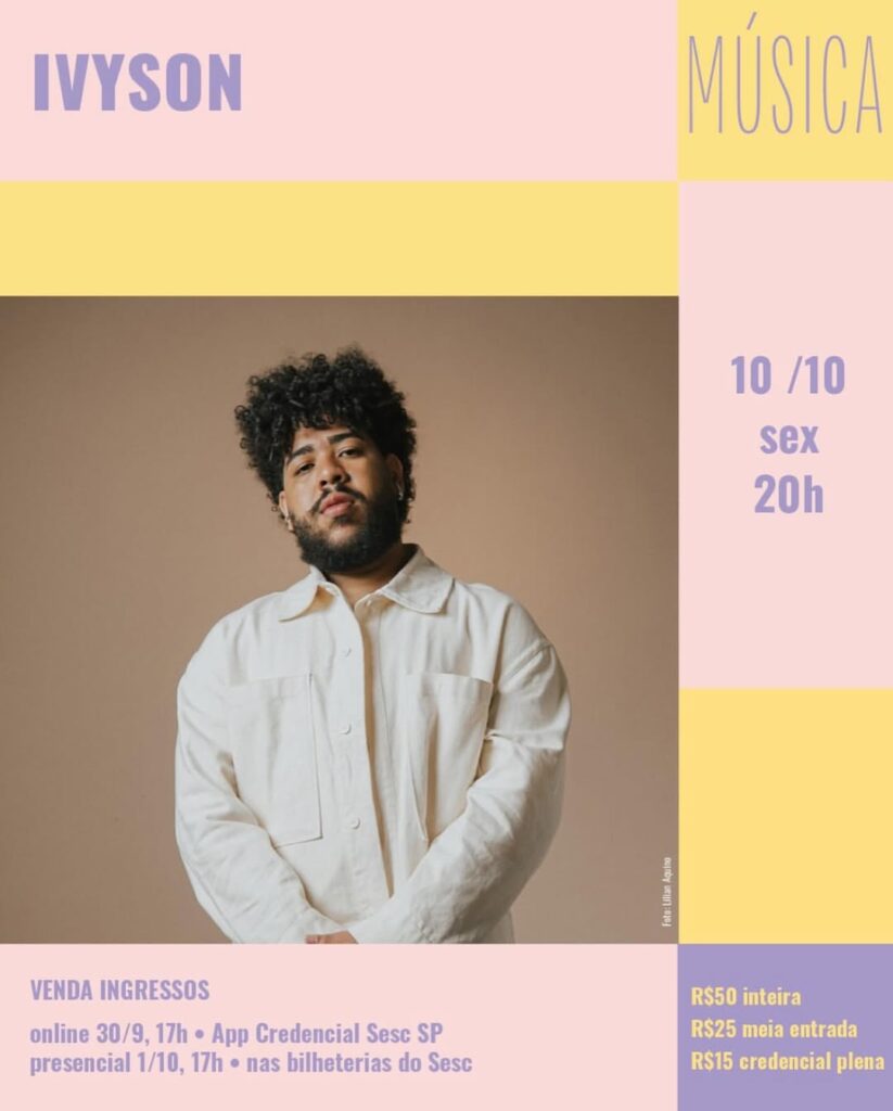 Tudo vai dar Sesc: Marcelo Jeneci Trio faz show sexta (10), às 20h30, no Belenzinho; Silvia Machete sexta (10), às 21h, no Belenzinho; Ivyson, sexta (10), às 20h, no Guarulhos; a mineira Clara Lima, sexta (10), às 20h, no Pompeia; Joyce Moreno sexta (10) e sábado (11), às 20h, no Pinheiros; Fabiana Cozza sexta (10) e sábado (11), às 20h, no Santana; Tássia Reis sábado (11), às 20h30, no Belenzinho; Tulipa Ruiz no sábado (11), às 20h, no Santo Amaro;